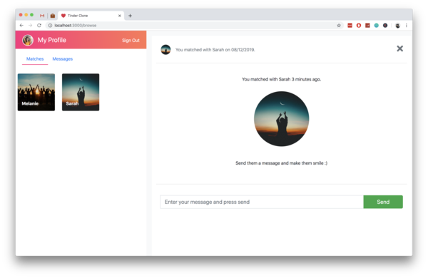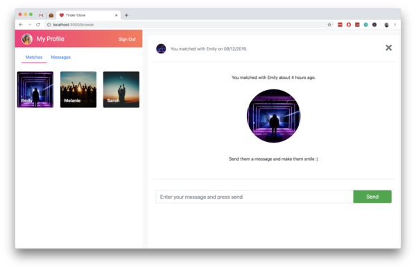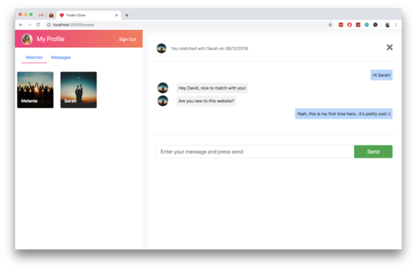Allow users to create a profile and browse and match with other users. Start a conversation with your matches and meet offline.